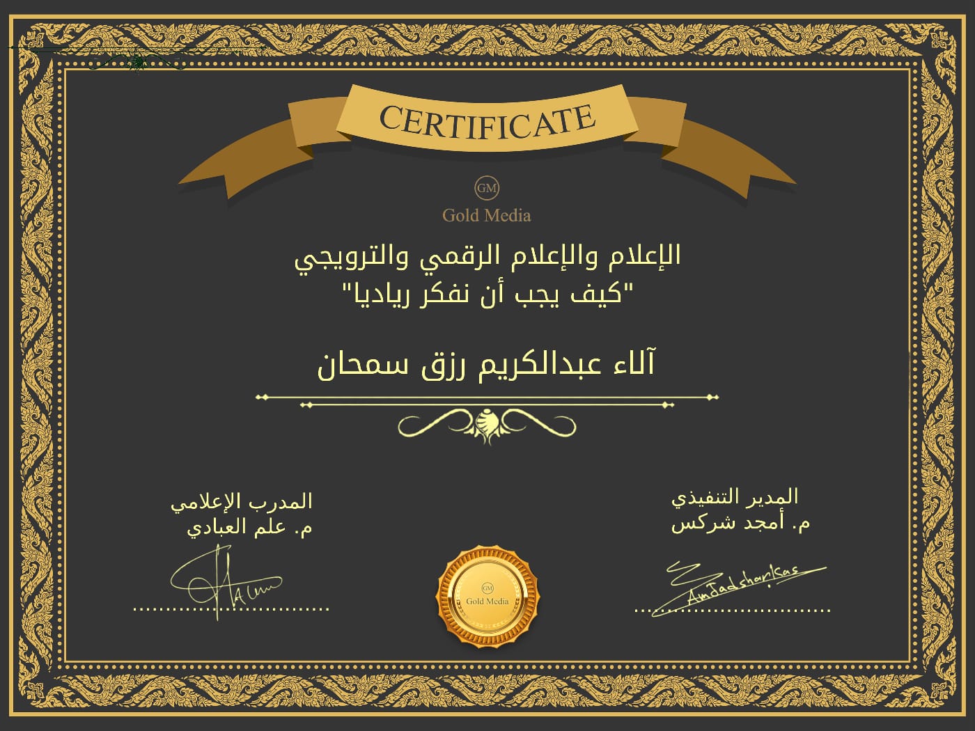 آلاء عبدالكريم رزق سمحان تحصل على شهادة دورة الاعلام من Gold Media