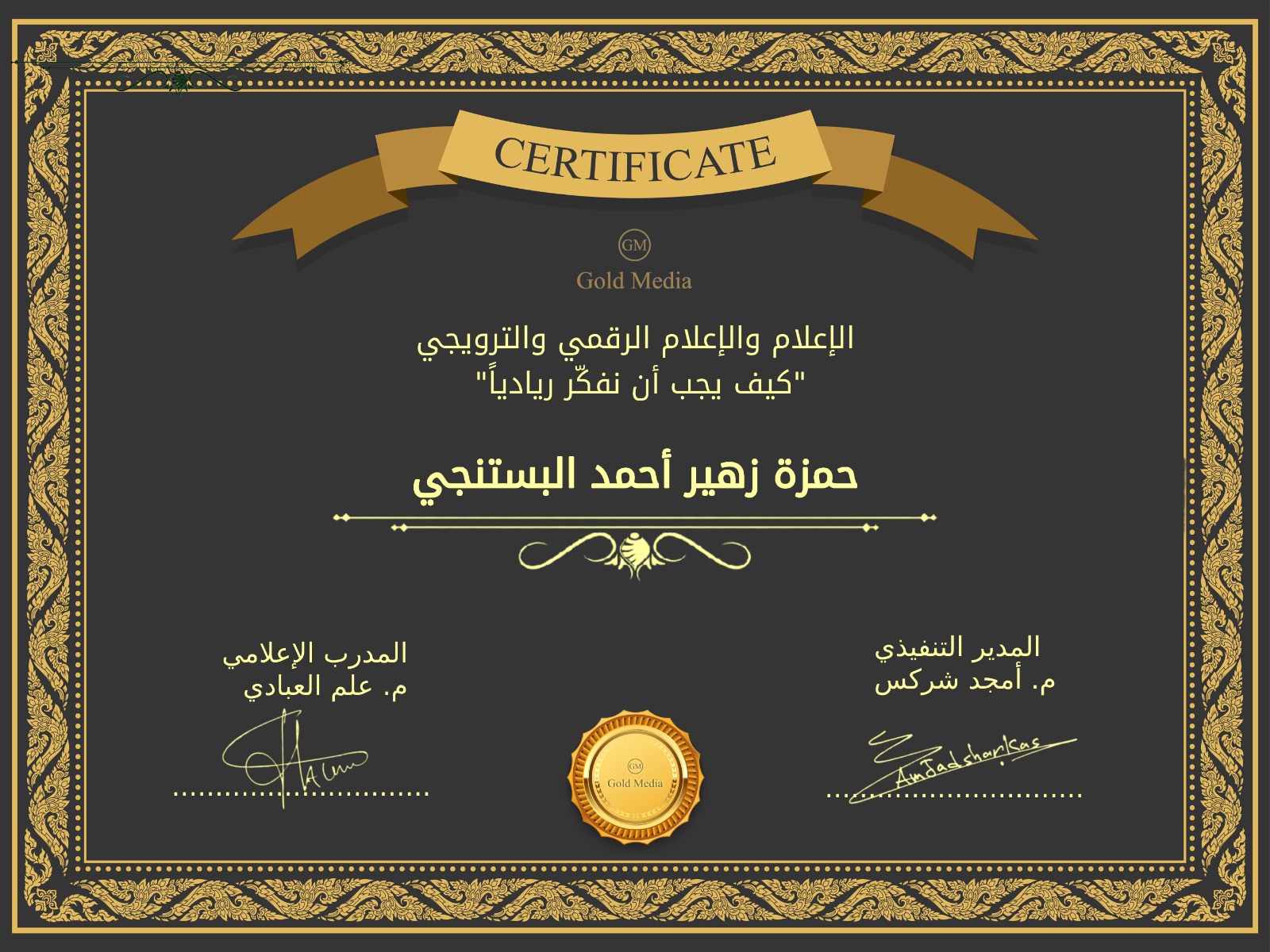 حمزة زهير احمد البستنجي يحصل على شهادة دورة الاعلام من Gold Media