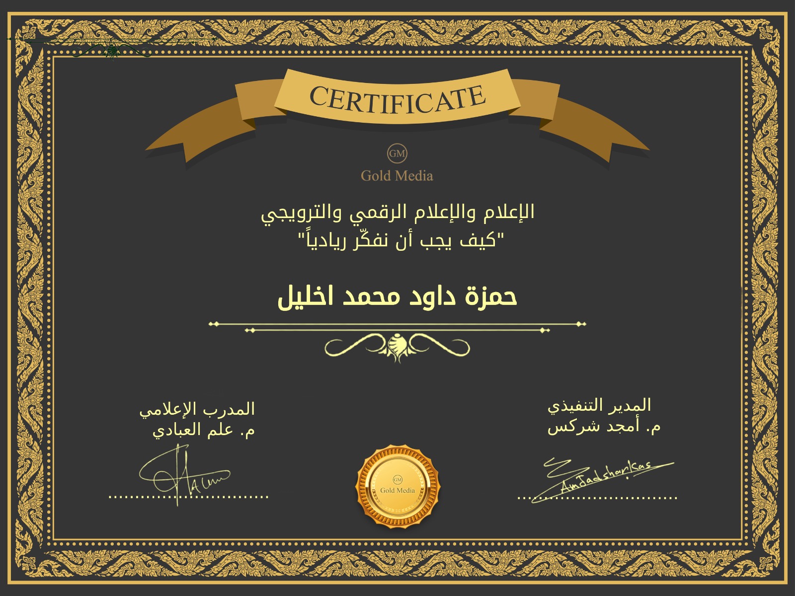 حمزة داود محمد اخليل يحصل على شهادة دورة الاعلام من Gold Media