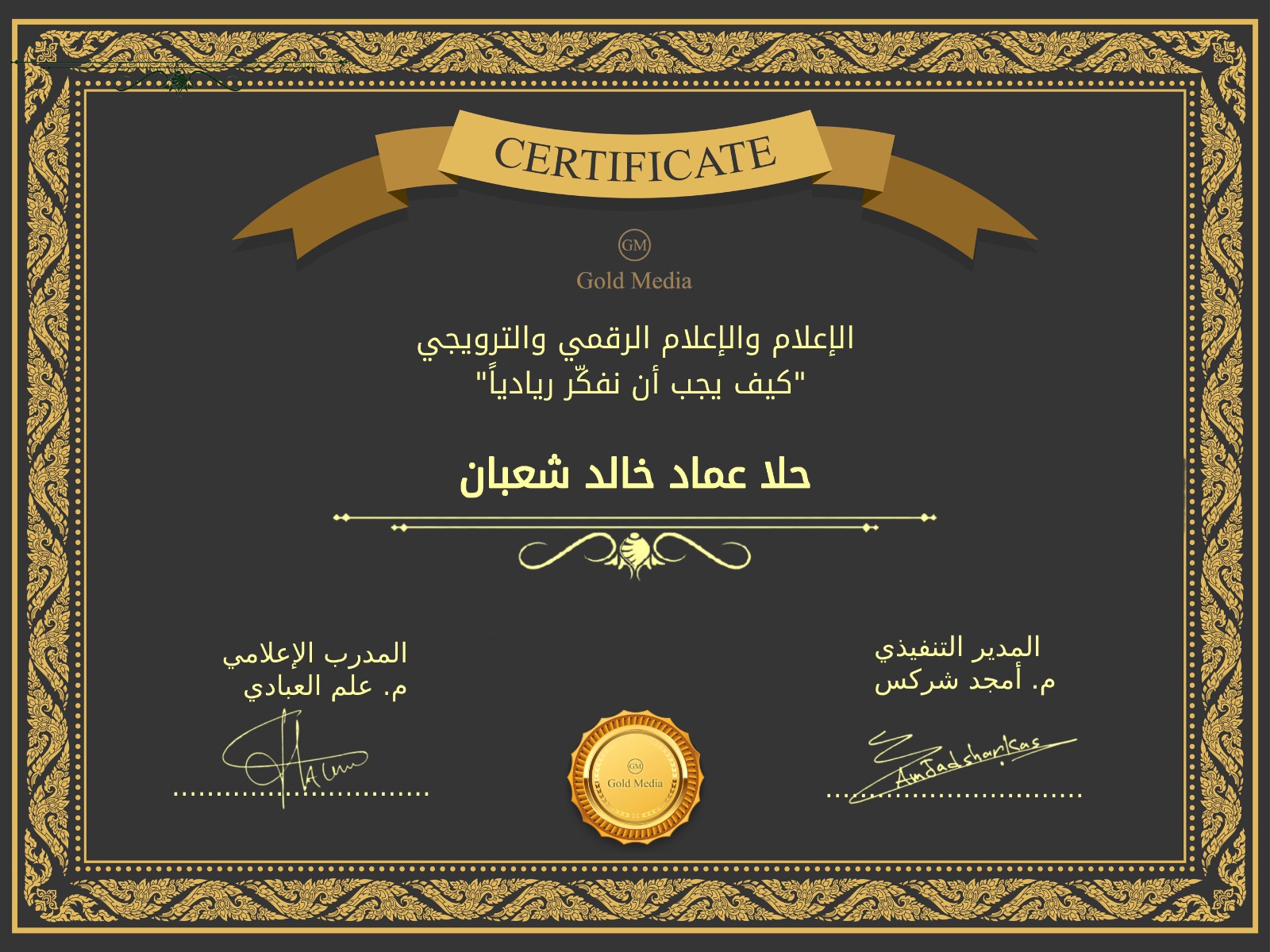 حلا عماد خالد شعبان تحصل على شهادة دورة الاعلام من Gold Media