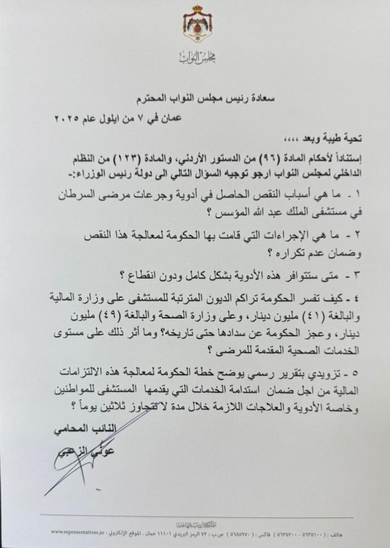 أخبار هنا العالم - وجه النائب عوني الزعبي، سؤالا نيابيا إلى الحكومة، حول أسباب النقص الحاصل في أدوية وجرعات مرضى السرطان في مستشفى الملك عبد الله المؤسس.