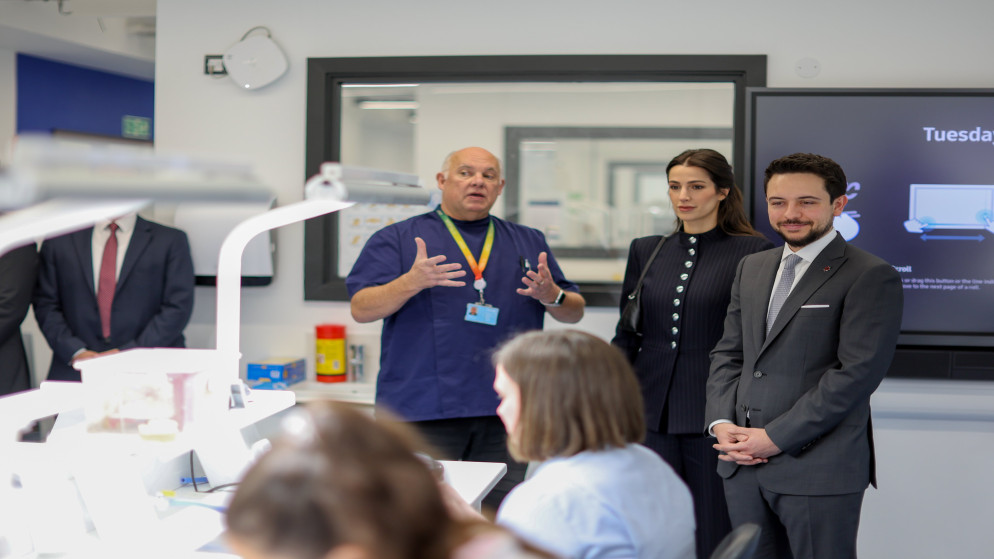 وخلال الزيارة، قام سمو ولي العهد وسمو الأميرة رجوة بجولة في مرافق الكلية، واطلعا على نماذج من أساليب التدريس والتدريب التقني المطبقة فيها، واستمعا إلى شرح من المعنيين حول آليات التطبيق العملي للبرامج التعليمية.