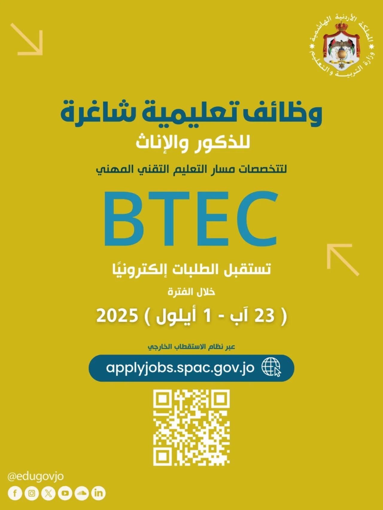 أعلنت وزارة التربية والتعليم في الاردن عن فتح باب التقديم على وظائف تعليمية شاغرة للذكور والإناث ضمن تخصصات المسار التعليمي التقني المهني (BTEC)، وذلك في إطار سعي الوزارة لتطوير التعليم المهني وتوفير كوادر مؤهلة وقادرة على مواكبة احتياجات سوق العمل.